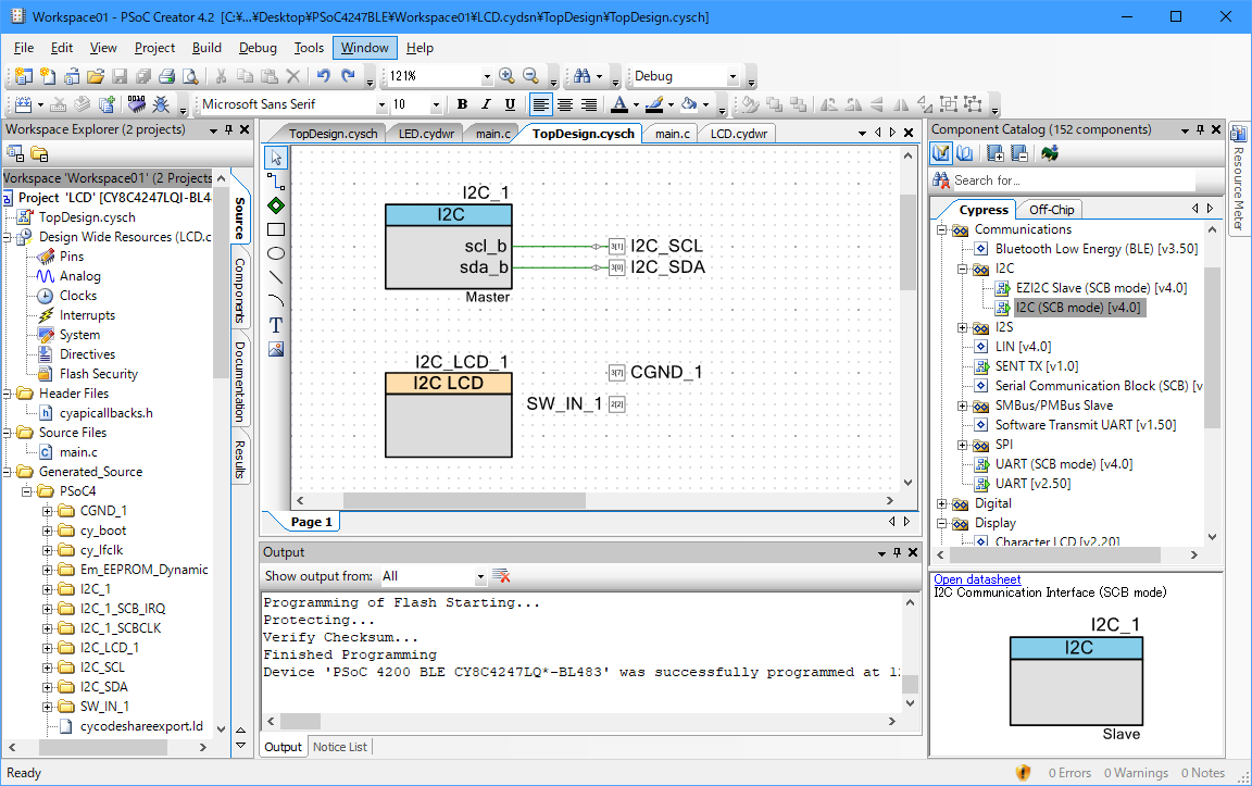 学部生、卒研生向け、プログラムとデバックの手順解説。ここでは、CY8CKIT-142 PSoC4 BLEモジュール(CY8C4247LQI-BL483搭載、技適認証済み)を使用しましたが、BLEを使わないなら PSoC4 CY8C4245あたりでも。