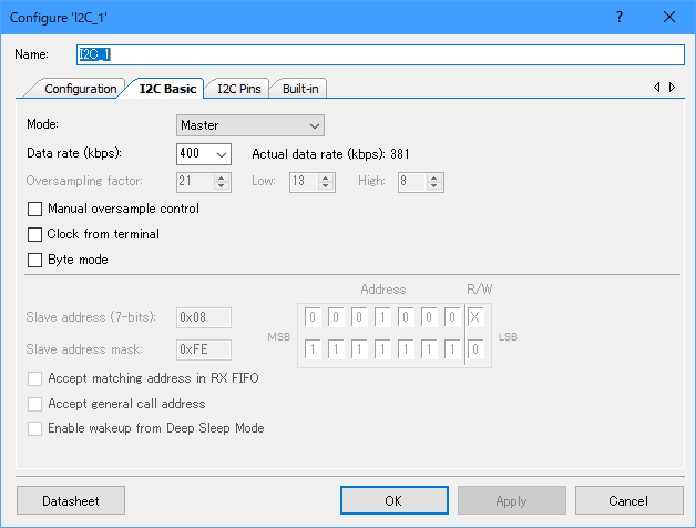 - I2C (SCB mode), Character LCD with I2C interface, Digital Bidirectional Pin 2個, Digital Input Pin, Digital Output Pin を配置する。I2Cの設定を Show I2C terminals に設定してからI2CモジュールとDigital Bidirectional Pin の配線を行う。