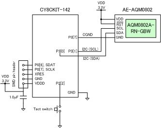 小型キャラクタ液晶ディスプレイの使用例。3.3V動作、I2C接続の Xiamen Zettler Electronics社 AQM0802A-RN-GBW を使用。秋月でピッチ変換キット(AE-AQM0802)が販売されている。また、電源制御例を示す。LCDは低消費電力だが、1mA程度消費するので、小容量バッテリーや環境エネルギー駆動の場合、スイッチを押したときだけ表示し、しばらく表示したら電源を切る。電源は、PSoCのGNDとは分離されたCGNDラインに接続し、CGNDをPSoCのIO(オープンドレイン)でON/OFFする。VDDはON/OFFせず、パスコンに充電した状態を保つ。