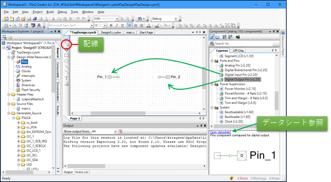 - 右欄のComponent Catalog - Cypressタブ - Ports and Pins - Digital Input Pin と Digital Output Pin をドラッグして各1個づつ回路図シート(TopDesign?.cysch)に配置
