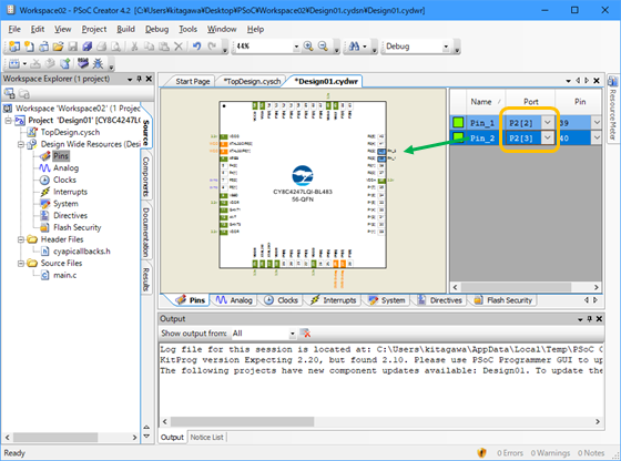 - 右欄のPin_1, Pin_2 をピンアサイン図(Design01.cydwr)のポートP2[2], P2[3]にそれぞれドラッグするか、右欄のPort列のドロップダウンリストから、割り当て先のポートP2[2], P2[3]を選択する