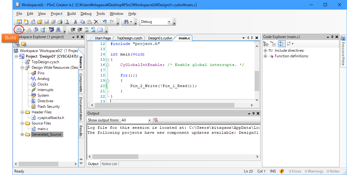 - Pin_2_Write(!Pin_1_Read()); では、Pin_1の状態(H or L)を読み取り、Pin_1の否定をPin_2に出力している