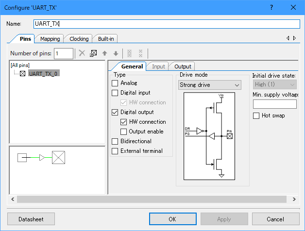 - UART(SCB mode)を配置し、rx_inにDigital Input Pin, tx_outにDigital Output Pin を配線接続する