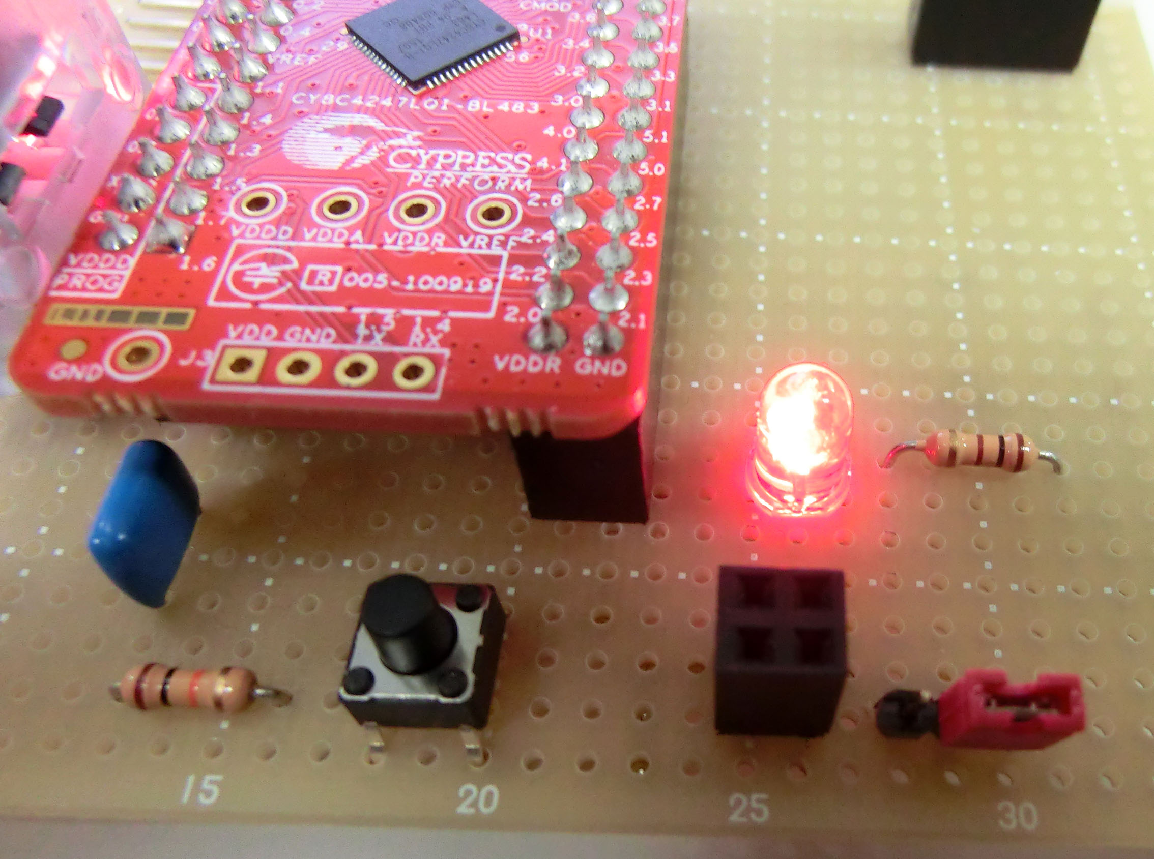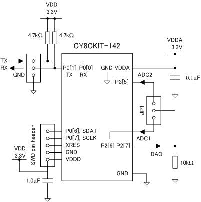 PCや無線モジュールとの標準的な接続方法の例。TXとRXは互いにクロスさせることに注意。プルアップ抵抗は、PSoCの入出力ピンで設定することもできるが、外部抵抗の使用が推奨されている。複数トークンを含む場合の受信処理は、ADCとIDACの項を参照。写真は、PCとの接続テストに使用した USB-Serial変換モジュール(スイッチサイエンス FTDI USBシリアル変換アダプター Rev.2)。