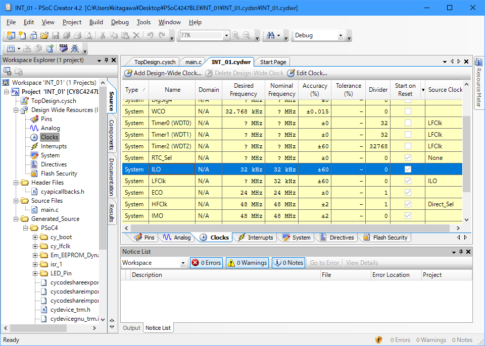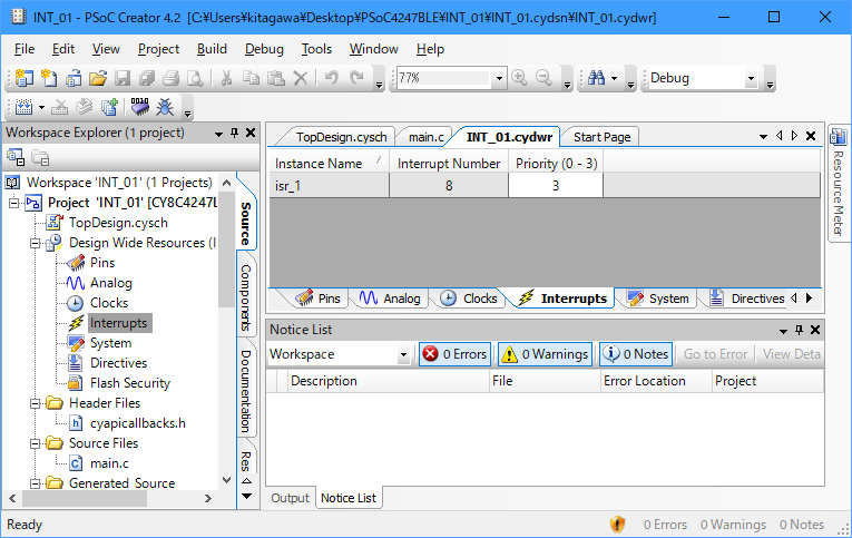 Cypress Semiconductor社PSoC Creator 関連のメモです。ここでは、PSoC4を使用しますが、PSoC3, PSoC5でも同じです。