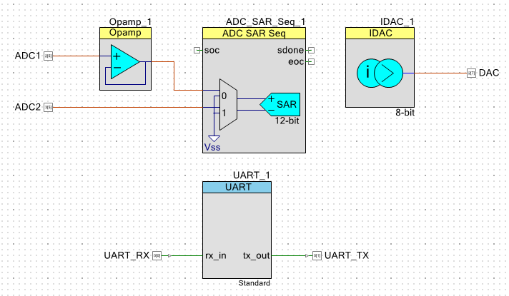 UART_1_UartPutString("ADC and DAC example with PSoC\r\n");