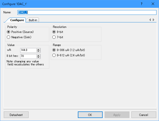 IDAC(Current Digital to Analog Converter)から出力した電圧をADC(SAR Analog to Digital Converter)で測定する例。電流出力のため、出力端子に接続した抵抗によって、出力電圧レンジが決定される。