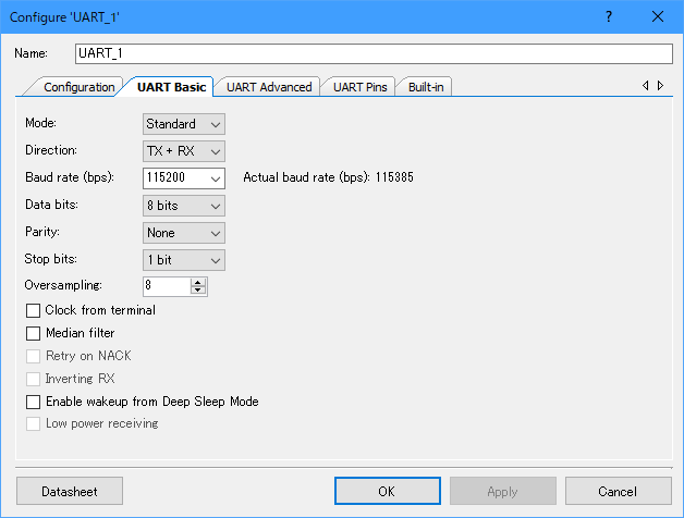 PSoC Creator の snprintf, sprintf では、%f ができないらしい(整数は問題なし)。以下のように対処する[UARTデータシート参照]。snprintf の使用例は、ADCとIDACの項で紹介。