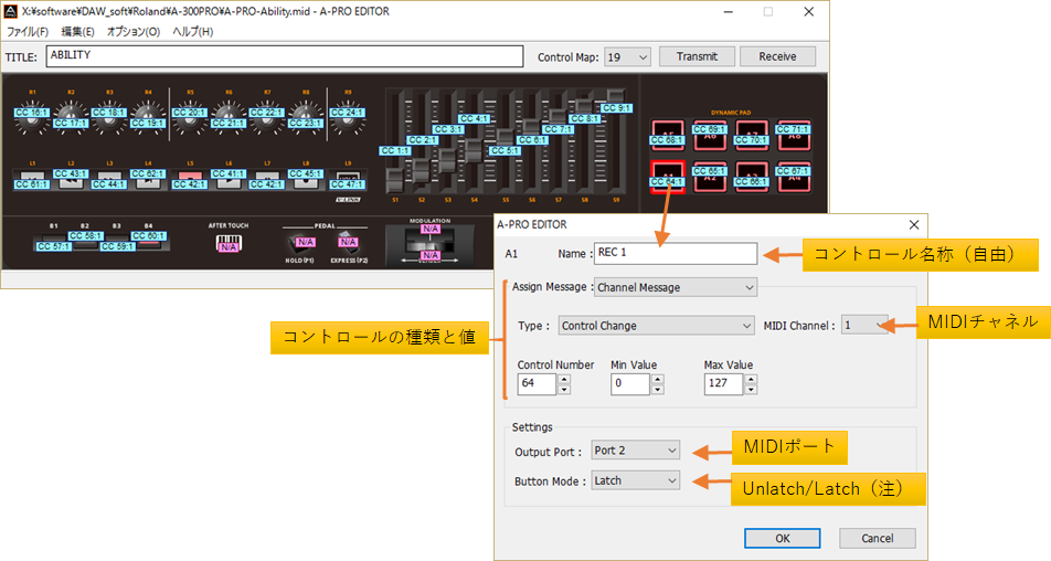 • CCモード:MIDIのコントロールチェンジ・メッセージを割り当てる方式(ACID, Abilityはこちら)