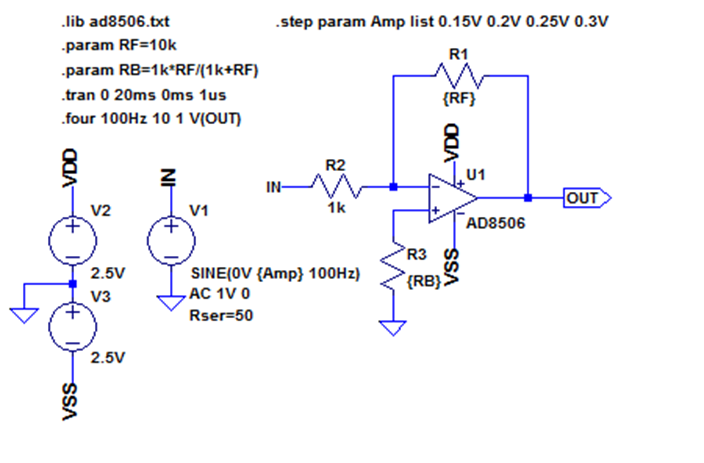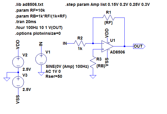- 「.options plotwinsize=0」を追加。「.four」と同様に、歪みを正確に調べるためには、このオプションが必要になる。