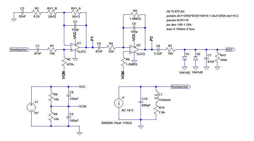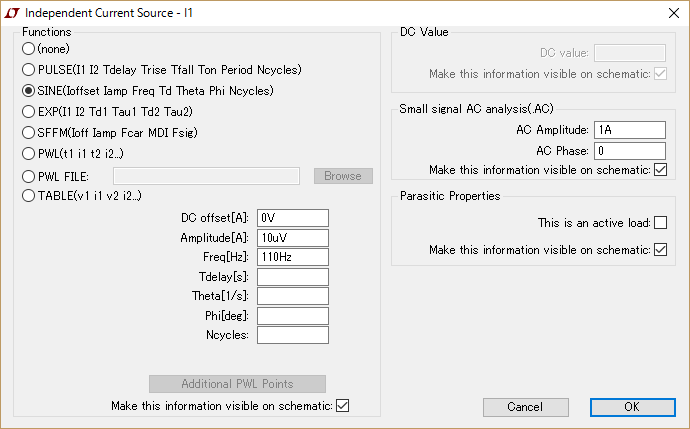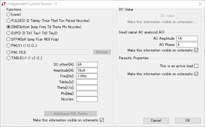 - 正:回路図2 I1 の下のSINE(0V 10uA 110Hz)