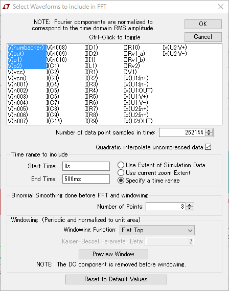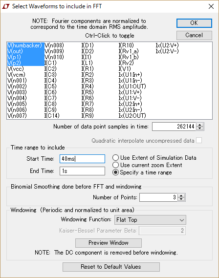 シミュレーション開始時の過渡応答を避けるために、「Start Time = 40ms」とする。また、「窓関数 」は対象とする波形に適したものを選択する。