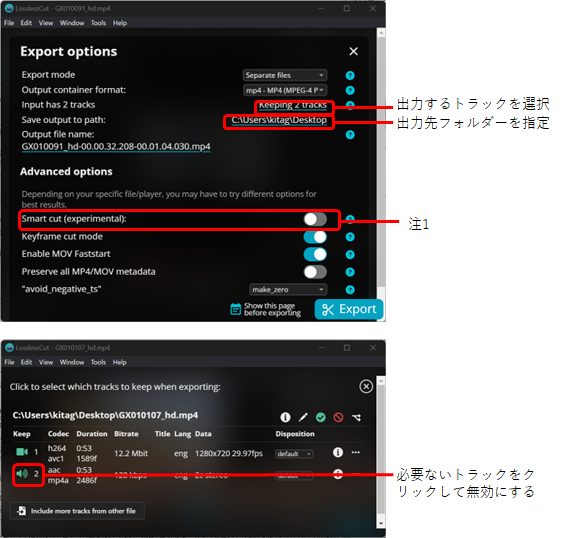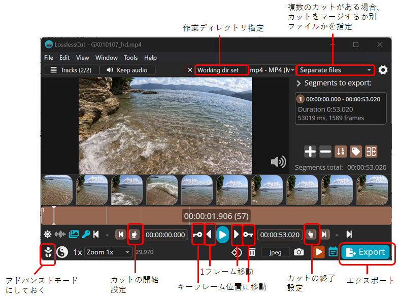 - [注1] カットはキーフレーム単位で行われるため、カット位置の微妙な時間調整ができない。カット位置をフレーム単位で行う場合は、Export Optionsフォームで、Smart cutをONにする。部分的にエンコードを行い、指定した位置でカットを行うらしい。