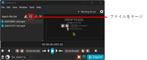 - カット済みのファイルをすべて読み込み、マージボタンをクリックすると、1つのファイルとして出力される